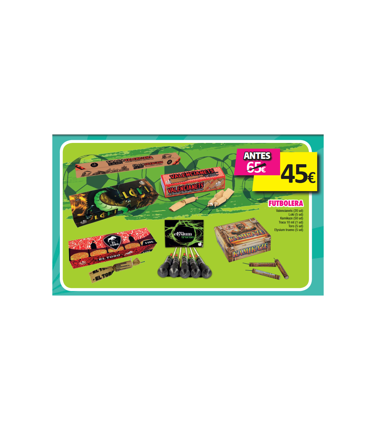 El surtido Futbolero es el aliado perfecto para los fans más fieles y auténticos de tu equipo. Incluye truenos, cohetes y una traca de 10 metros.