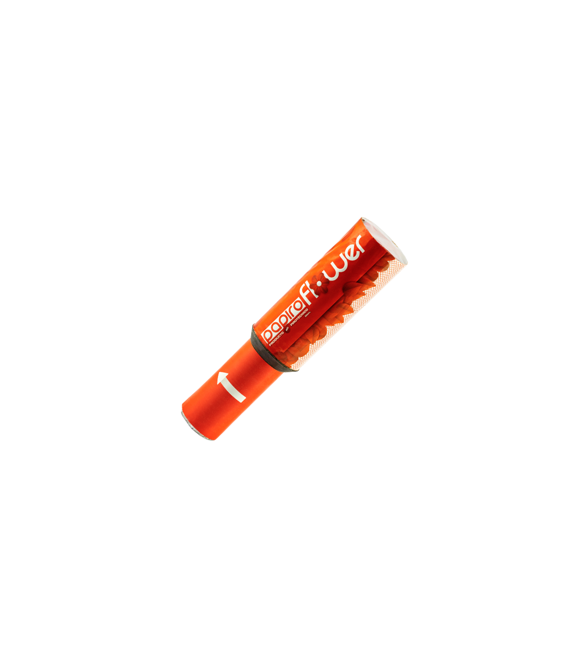 Tubo de aire comprimido de 80 cm de largo. Al rotar el tubo inferior en el sentido de la flecha se efectúa una descarga sonora que origina seguidamente una maravillosa lluvia de TIRAS DE COLORES EN PAPEL METALIZADO.